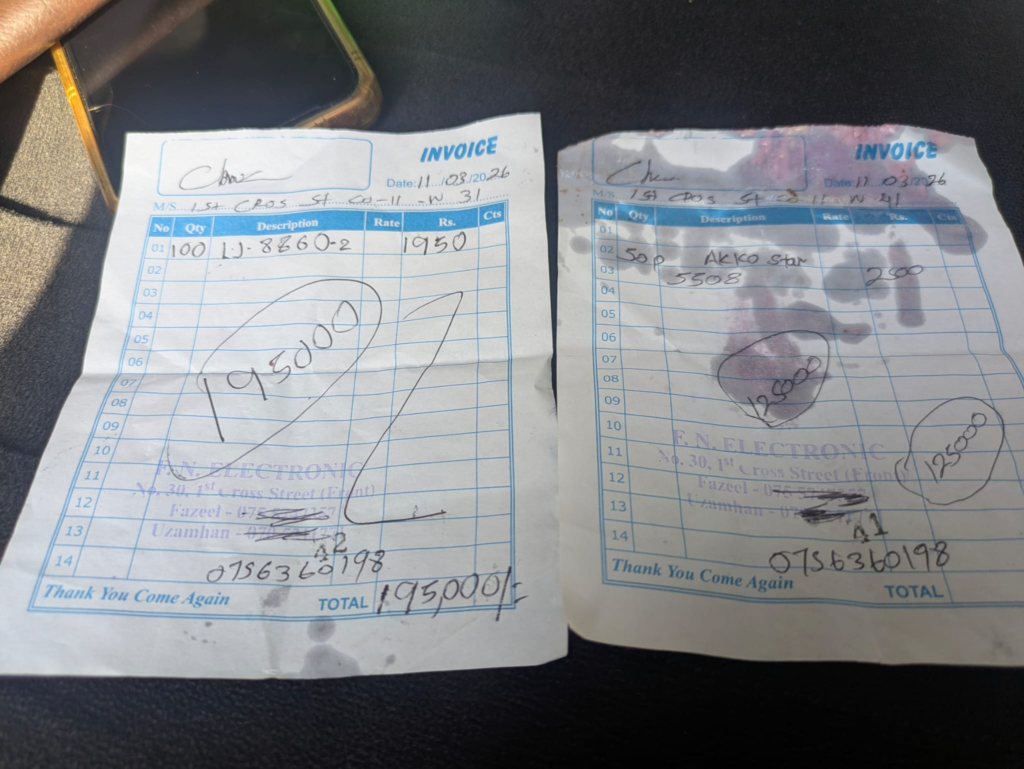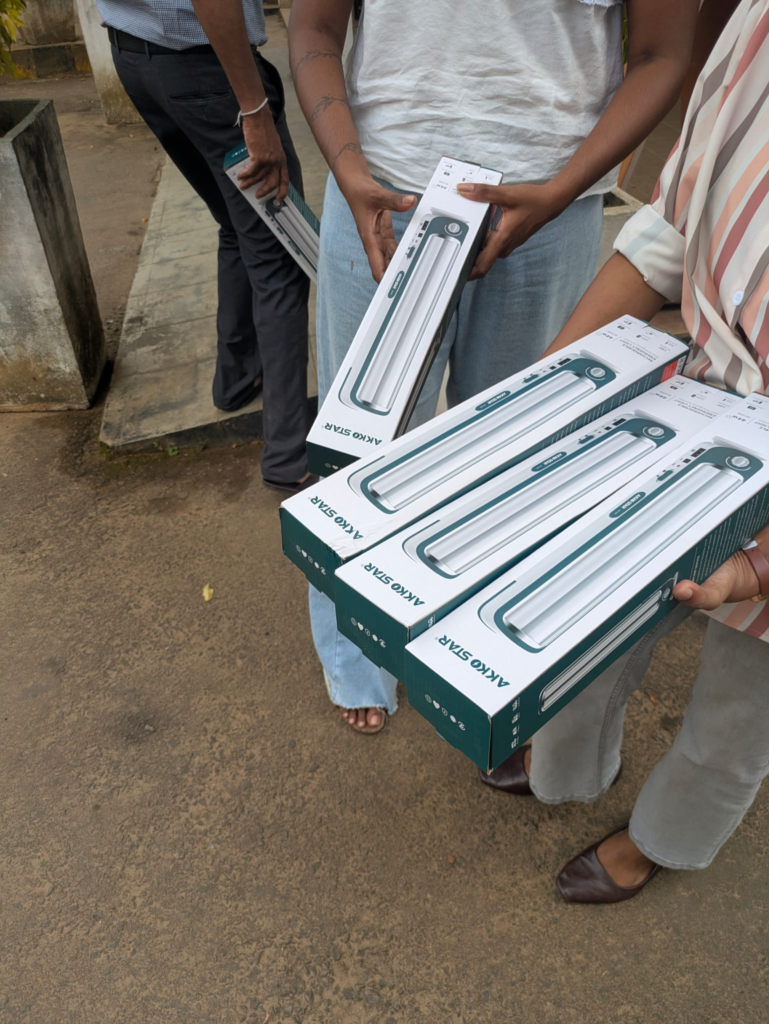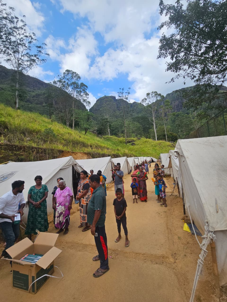 In Kotmale, the Divisional Secretariat in Tawalantenne requested makeshift rechargeable lights that could be used in the temporary camps where those affected by the disaster were living. Once again, the request was for lights for approximately 800–900 families, but we were only able to fulfil the request for 150 families. We purchased 150 AKKO STAR Dual LED Rechargeable Emergency Lights (6.8W). We personally handed over 25 of these lights at one of the camps where displaced persons are currently residing, as they are unable to return to their homes. The remaining lights were given to the Divisional Secretariat for distribution.